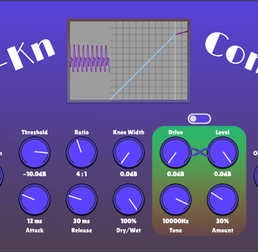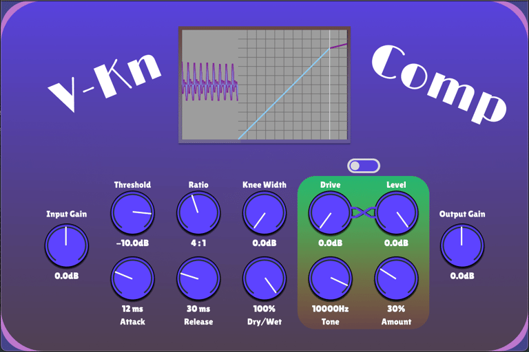 V-Kn Comp is a saturator and compressor in one package. Try it as a drum bus effect, a distortion, or a bass booster.