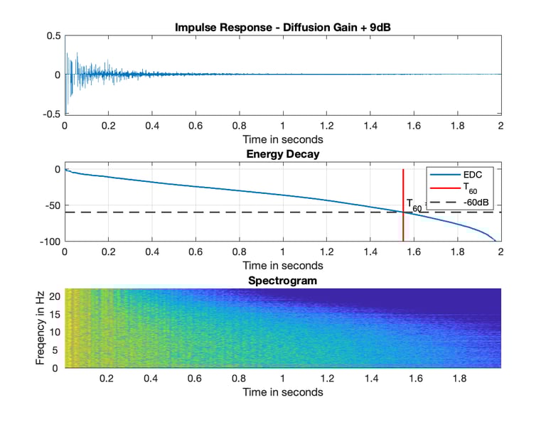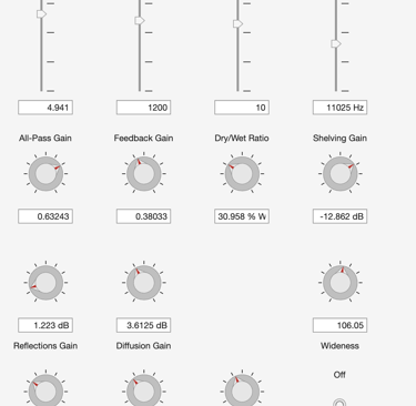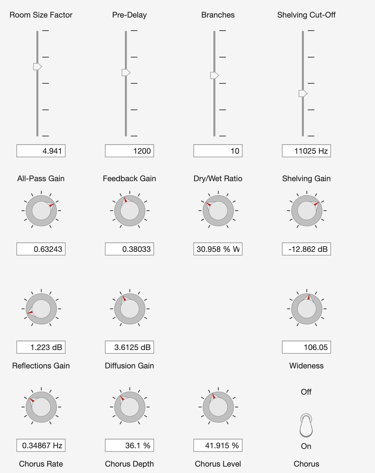 Once the main processing was completed, two new features were added, which helped to elevate the submission above the others. The first feature was a chorus effect, and the second was a Haas effect, labeled Wideness in the GUI. Additional functionality was added to increase the signal of the reflections or diffusions, which added further control to the decay characteristics.